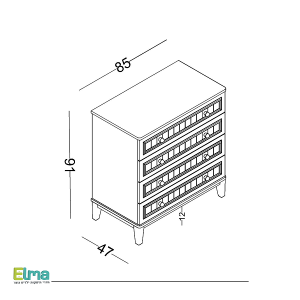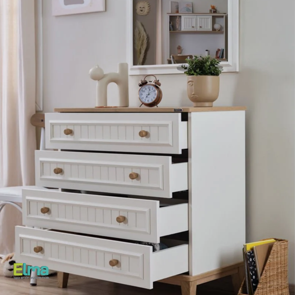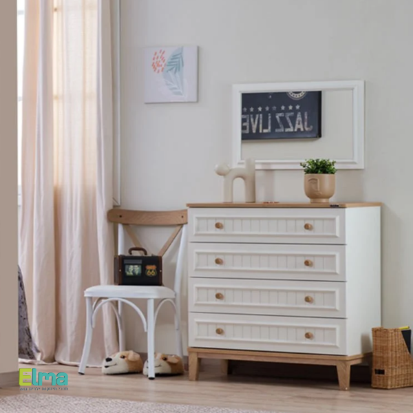 ✔ חומר עמיד ואיכותי – מלמין מצופה שבבית עץ.✔ מסילות מגירה נסתרות עם מנגנון בלימה לתנועה חלקה ושקטה.✔ חזית מגירות מעוצבת עם דפוסי לייזר ומשטח MDF עם פרופיל ייחודי.✔ ידיות בעיצוב עץ תואם לסט למראה אחיד ואלגנטי.✔ רגליים מחוזקות מפלסטיק ABS ארגונומי ליציבות משופרת.✔ פינות מעוגלות ורכות להפחתת סיכוני חבלה ופציעה.